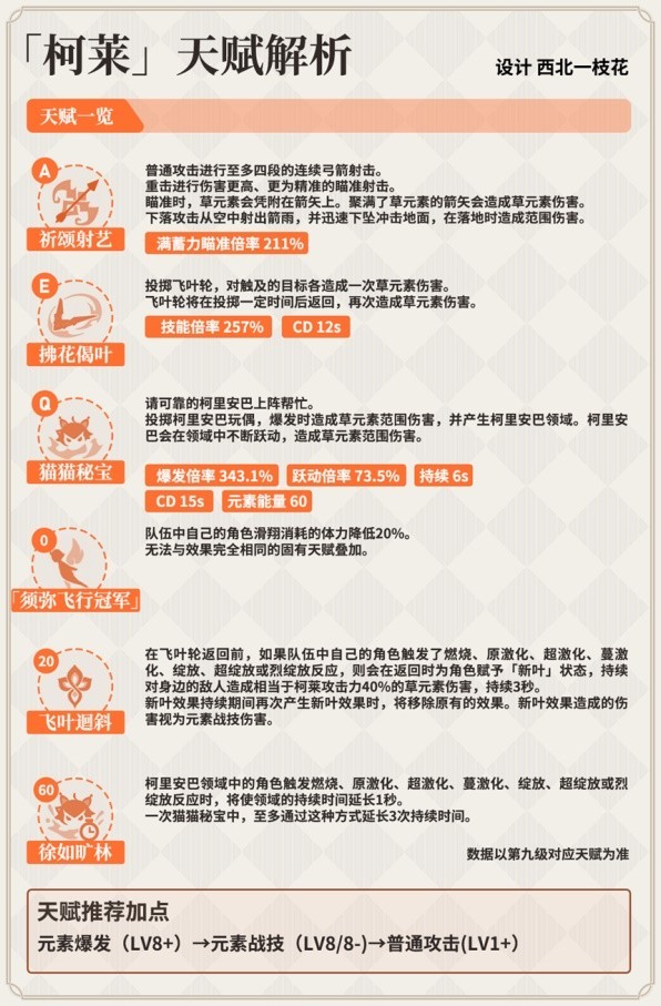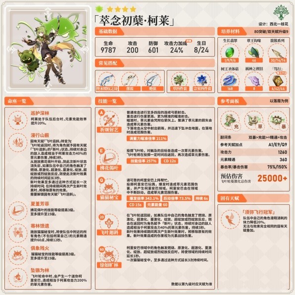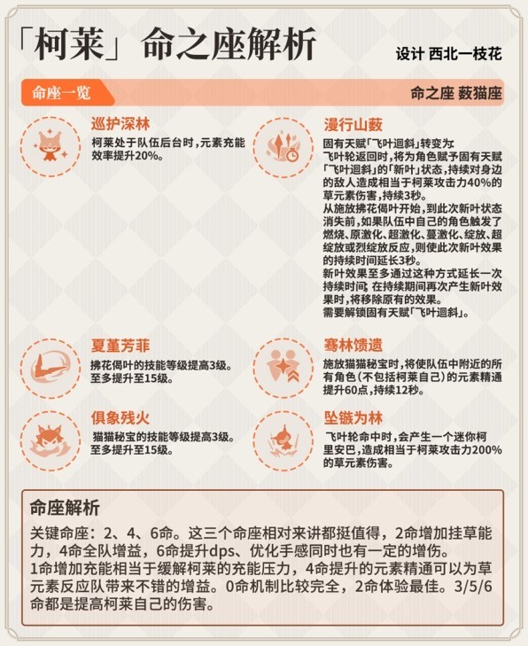 加点建议不要加点,或者换行秋组全四星队伍 。而相比较而言柯莱的出招十分不拖轴 ,可以充当一个副C角色 ,(难道这角色开服的时候就已经设计好了? ?) 。不推荐。提供的30草系减抗仅次于风套减抗 ,柯莱提供足量的草环境,而且相当于额外释放了草元素环境,